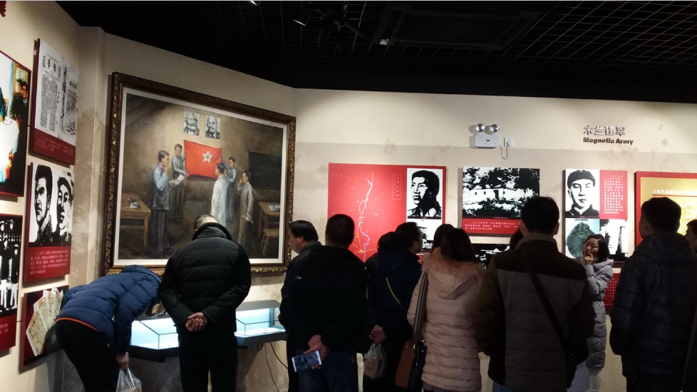 被譽為“武漢抗戰(zhàn)第一村”的姚家山村,有新四軍第五師司政機關舊址、李先念故居、機械所等10處革命遺址,其中新四軍第五師歷史陳列館是黃陂區(qū)政府為紀念抗日戰(zhàn)爭勝利70周年而新建的一座主題陳列館。支部書記李蔚林帶領全體黨員在新五師領導群像前,面對黨旗,莊嚴重溫入黨誓詞。