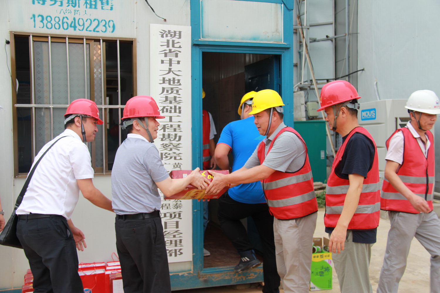 2019年7月9日下午,湖北省地質(zhì)局副局長李華、局工會四級調(diào)研員段風(fēng)華一行到中大工勘院宏泰廣場樁基工程施工現(xiàn)場“送清涼”,向項目管理人員發(fā)放防暑降溫物品,將局工會的關(guān)懷傳遞給每一位一線職工。