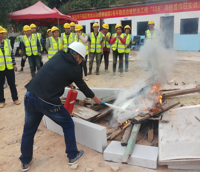 為進(jìn)一步提高處理消防突發(fā)事件的能力,11月6日上午,中大工勘院青龍山沿線滑坡群1號不穩(wěn)定邊坡防治工程項目部開展了一次消防實戰(zhàn)演練,講解了滅火器的使用原理、使用方式,模擬了火災(zāi)發(fā)生后的消防應(yīng)急處置。